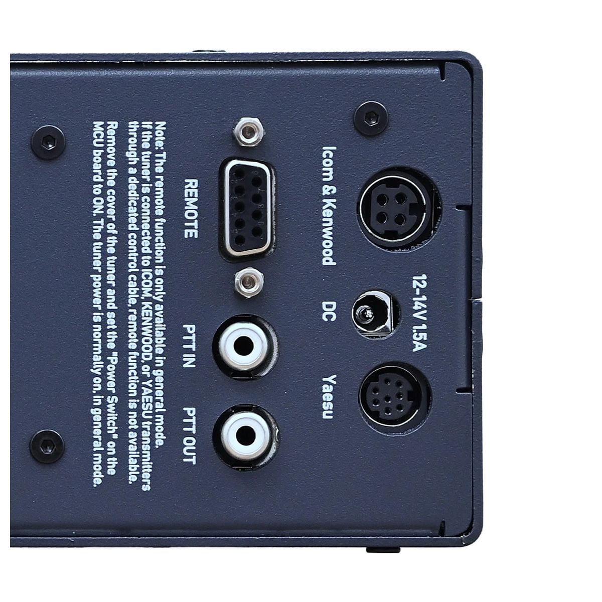 Conectica include intrare RF (RF-IN), două ieșiri antenă (ANT1/ANT2), terminal de împământare, interfețe dedicate pentru YAESU, ICOM și KENWOOD, alimentare DC și port RS232 pentru control remote. :contentReference[oaicite:2]{index=2}