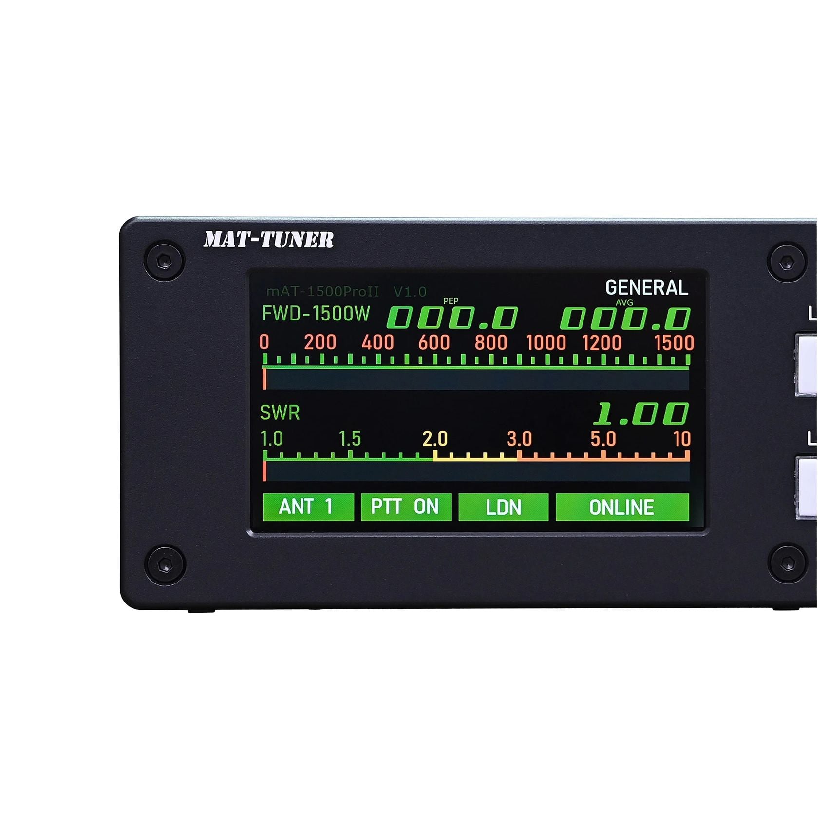 Echipamentul integrează un ecran LCD color de 4.3 inch cu rezoluție 800×480, care afișează în timp real puterea RF (PEP și AVG), SWR și starea de funcționare. În modul BYPASS, dispozitivul funcționează ca wattmetru și analizor SWR precis.